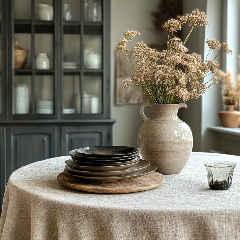 Die Breite des Stoffes beträgt 150 cm, daher werden bei größeren runden Tischdecken dezente Nähte auftreten.