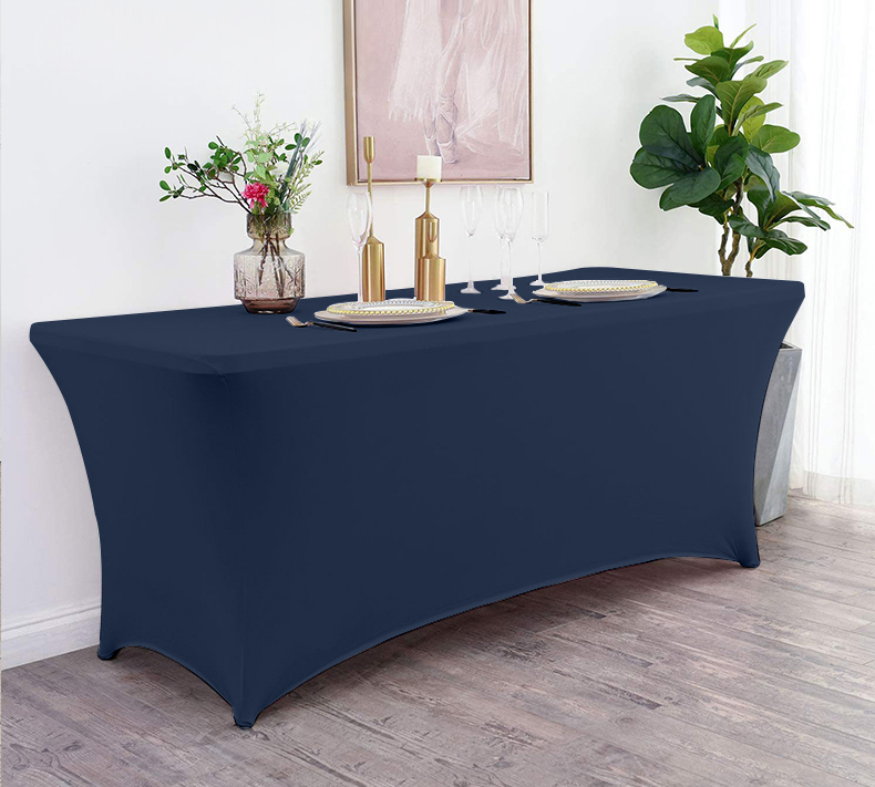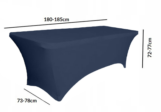 - Dunkelblaue elastische Tischhusse – elegant, passgenau und perfekt für Veranstaltungen.