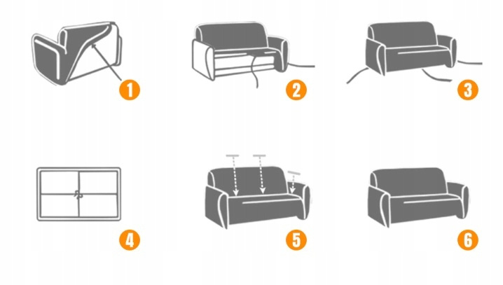 1. Finde das Etikett und lege den Bezug gemäß der Abbildung Nr. 1 auf das Möbelstück (das Etikett sollte sich letztendlich in der Mitte, unten auf der Rückseite des Sofas befinden).