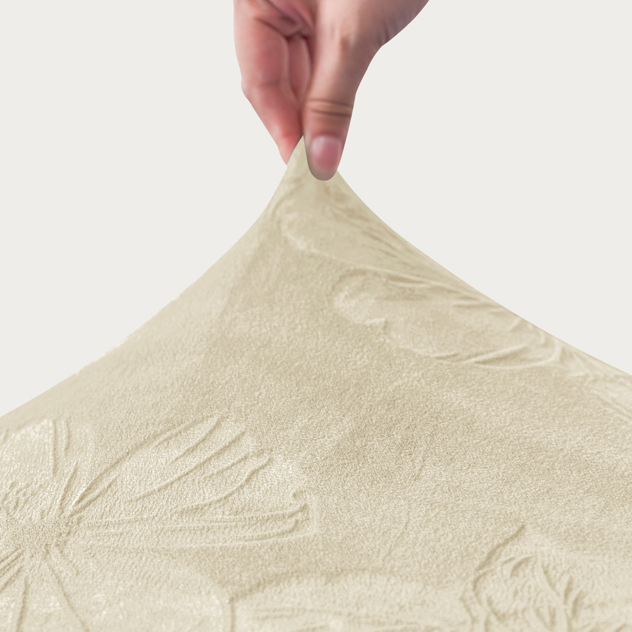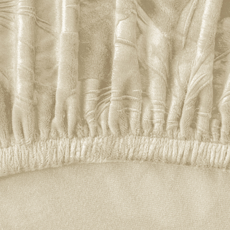 Der Bezug besteht aus weichem Velours mit geprägtem Blumenmuster. Durch den Anteil an Elasthan passt sich der Stoff der Form des Möbelstücks an und kehrt in seine ursprünglichen Maße zurück.