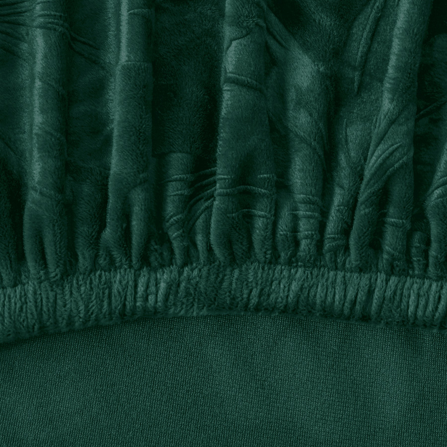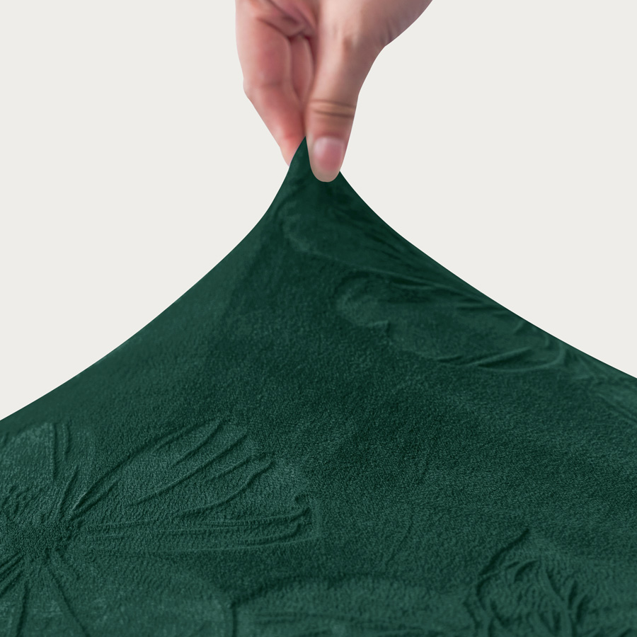 Der Bezug besteht aus weichem Velours mit geprägtem Blumenmuster. Durch den Anteil an Elasthan passt sich der Stoff der Form des Möbelstücks an und kehrt in seine ursprünglichen Maße zurück.