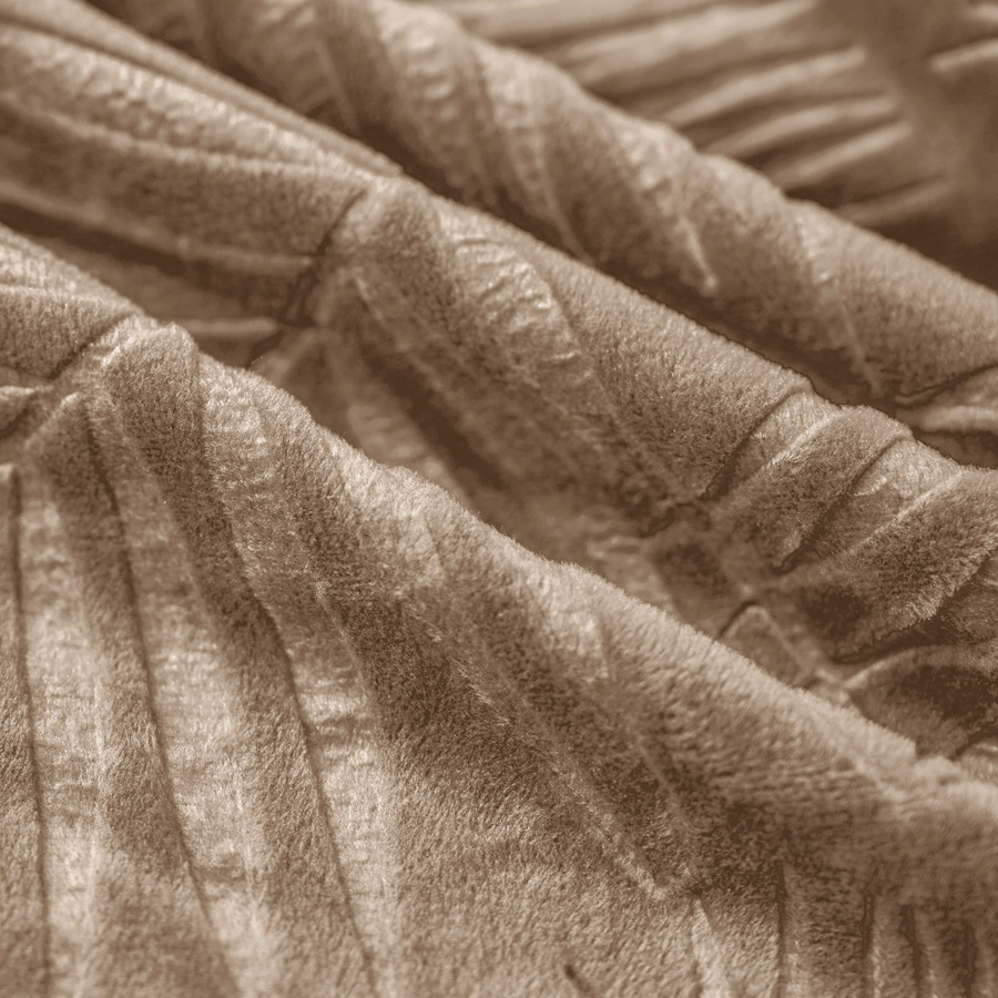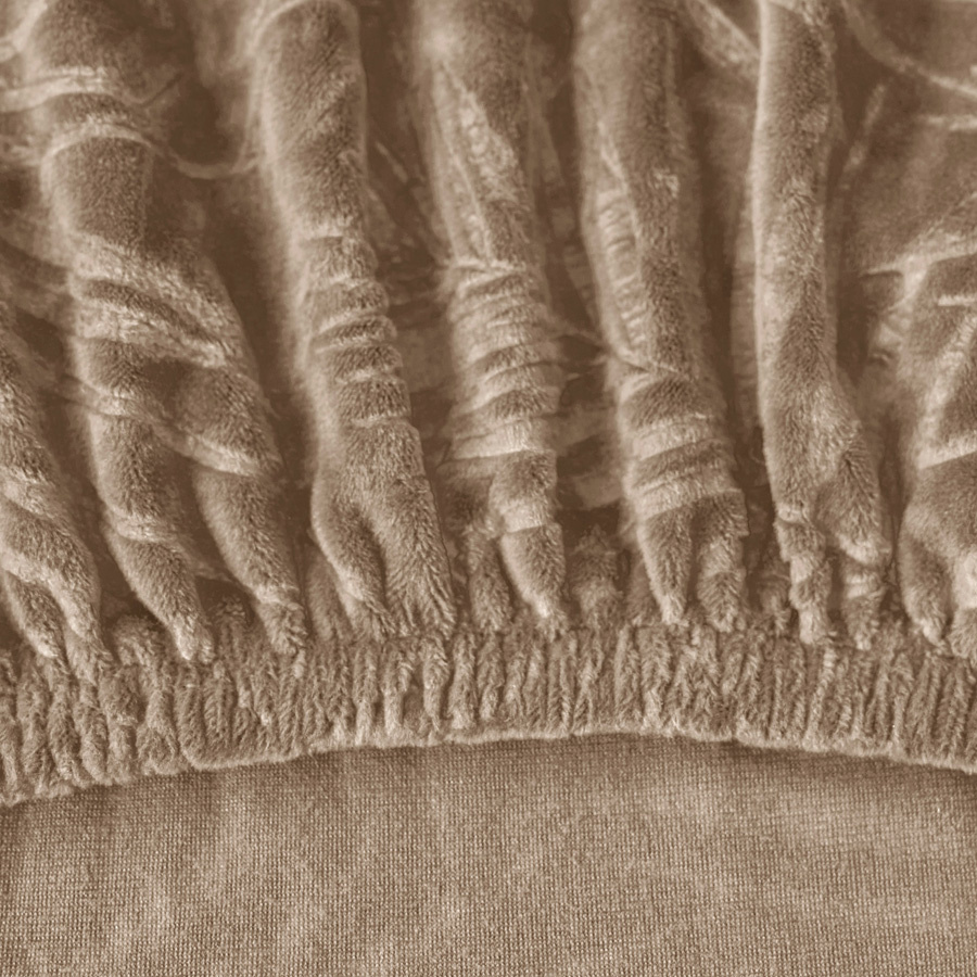 Der Bezug besteht aus weichem Velours mit geprägtem Palmenblattmuster. Dank des Elasthan-Anteils passt sich der Stoff dem Möbel an und kehrt immer wieder in seine ursprüngliche Form zurück.