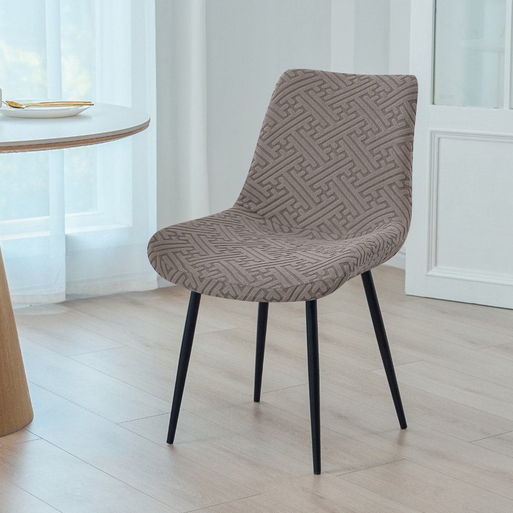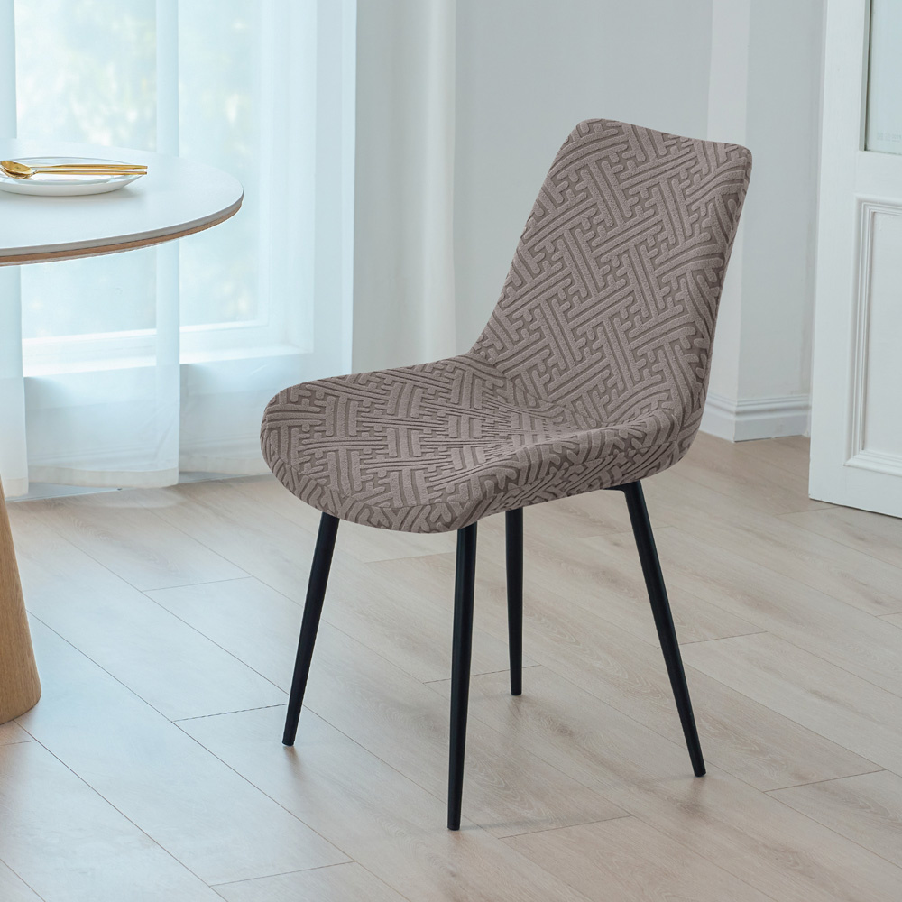 Die Hussen sind aus einem weichen, dicken Stoff mit elegantem geprägtem Muster gefertigt. Dank des Anteils an Elasthan passt sich das Material ideal an den Stuhl an und kehrt in seine ursprüngliche Form zurück.